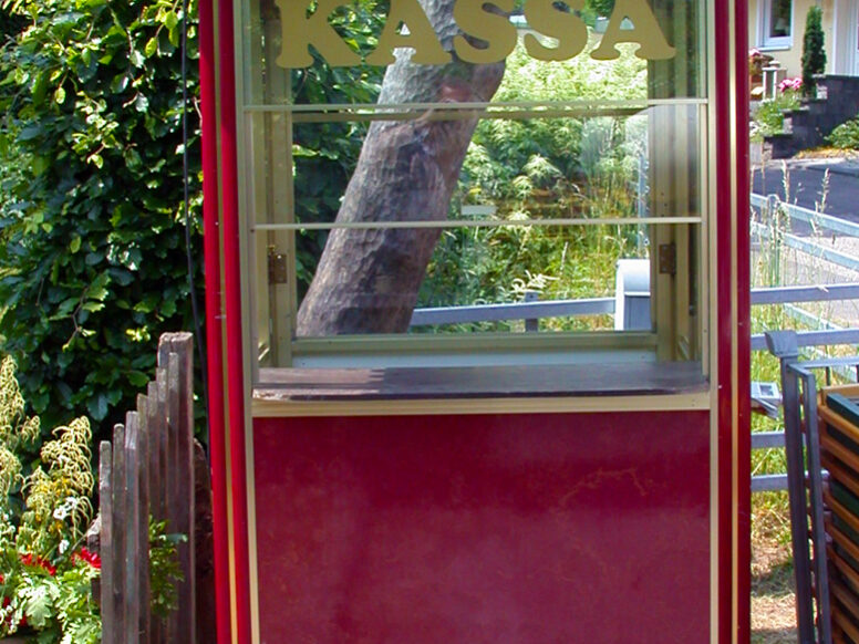 Alluring ticket office, lit up on 3 sides from the outside. Illuminated sales counter with seating for one person. The front window has a sliding glass plane to open. The ticket office stands on a platform 115cm x 115cm. Total height is 206cm.